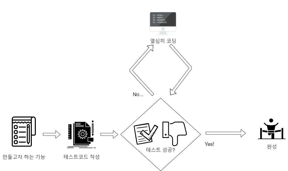 Test가 주도하는 개발입니다. TDD를 적용한 개발에서는 기능 개발 전 테스트코드를 먼저 작성합니다. 당연하게도 테스트는 실패하고 이 테스트를 성공하기 위한 코드를 작성하는 것을 목표로 합니다. 먼저 작성해둔 테스트 코드를 성공해야만 개발이 끝나기 때문에 작성한 테스트는 개발을 전반적으로 주도하게 됩니다. 그래서 이를 TDD(Test Driven Development), 테스트 주도 개발이라고 합니다.