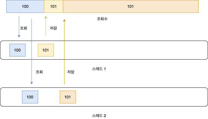 멀티 스레드 환경에서 스레드 안전(Thread-safe)한 프로그램을 제작하기 위해서는 어떤 경우에 스레드 안전하지 않은 동작이 생기는지 먼저 만들어볼 필요가 있습니다. 정말 간단한 예제로, 조회수 계산 로직을 만들어보겠습니다. 특정 글을 조회하는 순산 원래 조회수에 1을 더한 값을 저장할 것이고, 여러 사용자가 동시에 접근할 것이므로 멀티 스레드 환경에서 동작한다고 가정해보겠습니다.