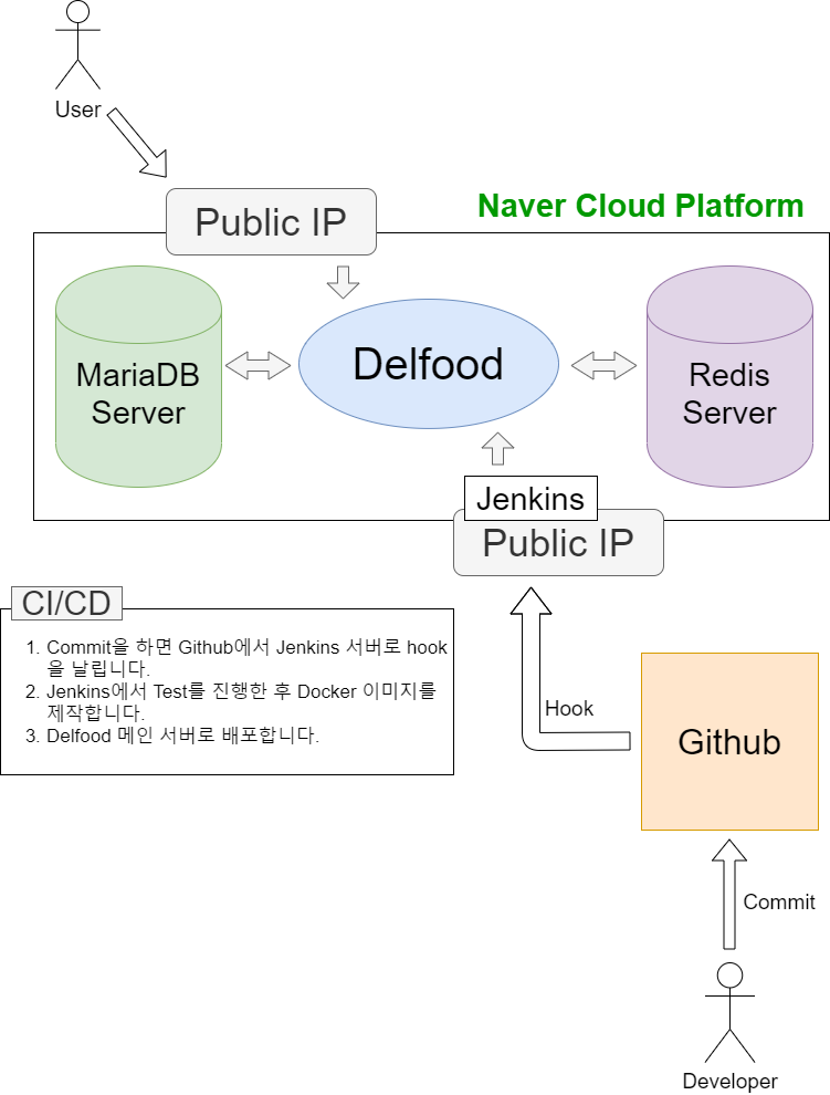 제가 작성한 토이 프로젝트인 DelFood에서 CI/CD를 구현하였습니다. DelFood는 아래 사진과 같은 구조로 설계한 애플리케이션 서버입니다. 빌드 - 테스트 - 배포까지의 과정이 너무 귀찮아서 CI와 CD를 구현한 제 사례를 이야기해보고 싶습니다.