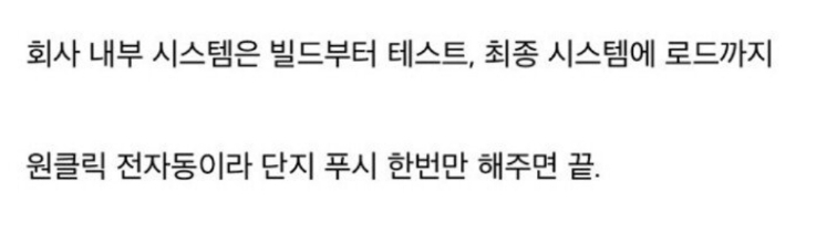 - '원클릭으로 빌드, 테스트, 배포 자동화'를 진행할 수 있습니다. 즉 소스코드 변경부터 배포까지의 작업을 자동화할 수 있기 때문에 수작업으로 할 때의 불편함을 줄일 수 있습니다.