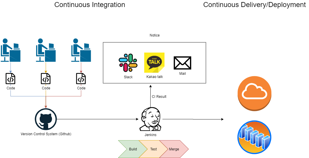 - CI툴에서는 변경된 소스코드를 대상으로 Build, Test, Merge를 진행합니다. 이 과정들이 완료되면 슬랙, 카카오톡, 메일 등을 통해 통합 결과를 알립니다.