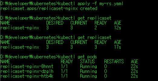 레플리카셋을 선언하였지만 이미 파드의 개수가 3개라면 레플리카셋은 더이상 파드를 생성하지 않습니다. 레플리카셋은 파드를 생성하기 위한 목적이 아닌, 파드의 개수를 일정하게 유지하는 것이 목적이기 때문입니다. 위 내용을 my-re.yaml 파일로 생성한 후, kubectl apply -f my-rs.yaml 명령어를 실행한 결과는 아래와 같습니다.
