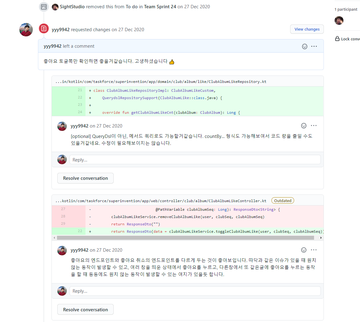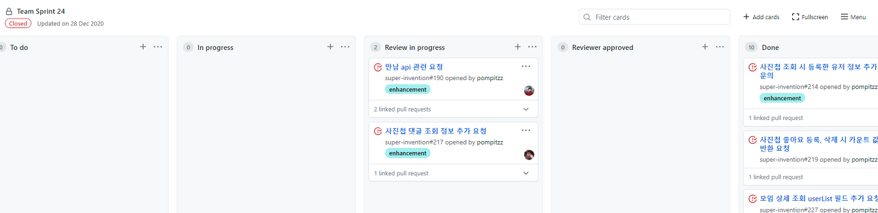 이를 통해 Front/Back 의 협업의 효율을 높일 수 있었고 서로가 하는 작업에 대해 진행중, 리뷰중, 반영 완료중 어디까지 완료가 되었는지도 알 수 있었습니다.