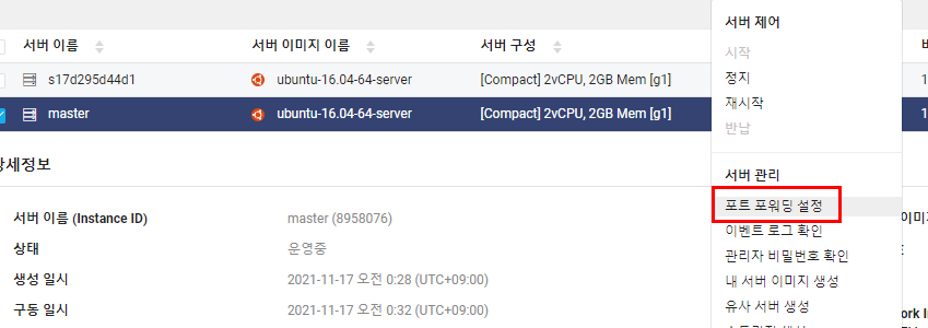 서버 발급 이후에는 접속을 위해 포트 포워딩 설정을 진행해야 합니다. 서버 우클릭 > 포트 포워딩 설정으로 들어가면 되며, 포트는 아무 포트나 입력해주세요! 저는 각각 2222, 2223번 포트를 할당해주었습니다.