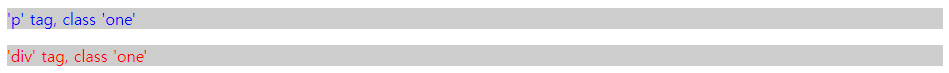 p태그는 color에 blue, div태그는 color에 red, one class는 background에 회색을 주었습니다.