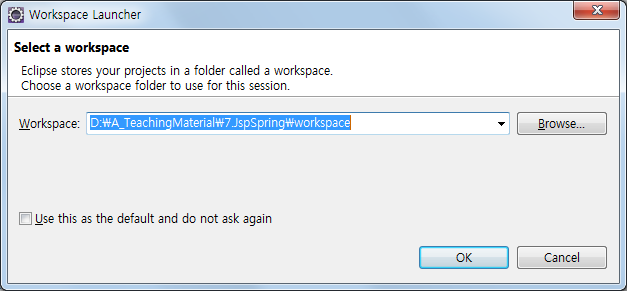 이클립스 시작 전, 작업 내역을 어느 폴더에 저장할지 정해야합니다. 기본 설정으로 하셔도 되고, 다른 폴더를 지정해주셔도 됩니다.
