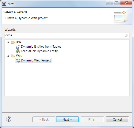 Ctrl + n을 누른 후 Wizards에 'dina'를 입력하면 'Dynamic Web Project'가 검색됩니다.