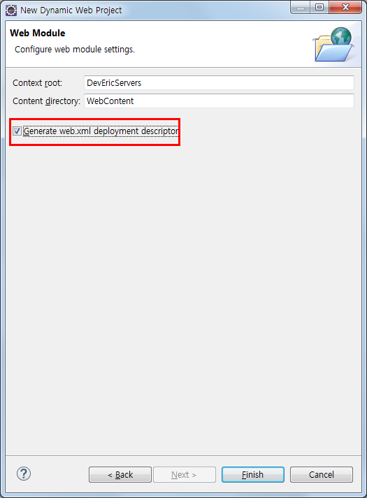 Generate web.xml을 체크해주면 web.xml파일이 자동생성되어 들어가게 됩니다.