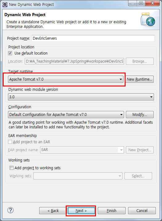 Target runtime에 이전에 설정해둔 Apache Tomcat을 선택해 준 후 Next를 눌러 다음으로 넘어갑니다.