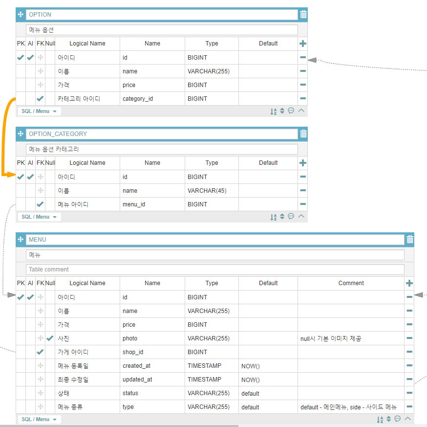 Category에 있는 부분을 테이블로 따로 뺐지만, 카테고리 테이블은 자체적으로 가지고 있는 정보가 얼마 되지 않는다고 판한하였고 메뉴옵션 카테고리의 테이블 정보를 메뉴 옵션에 포함시키는 방법을 고려하였습니다.