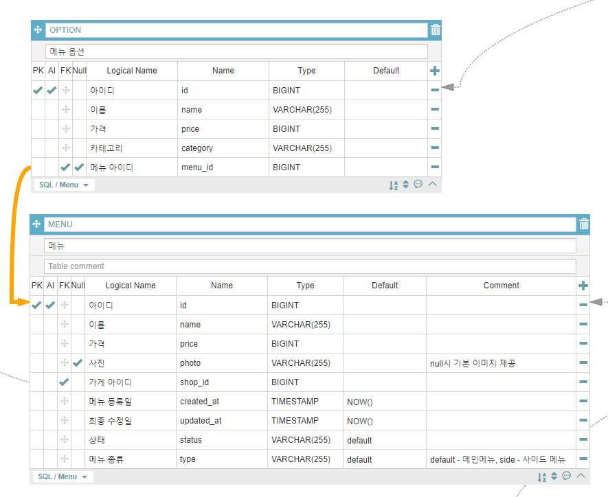 '메뉴 옵션' 테이블에 추가할 컬럼은 '메뉴 옵션 카테고리'가 가지고 있는 정보인 '카테고리 이름'과 '메뉴 아이디'입니다.