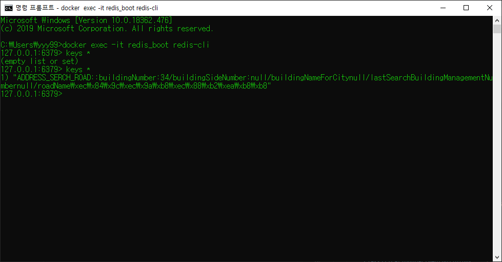 도로명 주소 검색으로 정확히 캐시가 저장된 것을 확인할 수 있었습니다. 한글이 깨지는 것은 인코딩 문제인것같은데 추후 이 이슈를 해결해야 할것 같습니다.