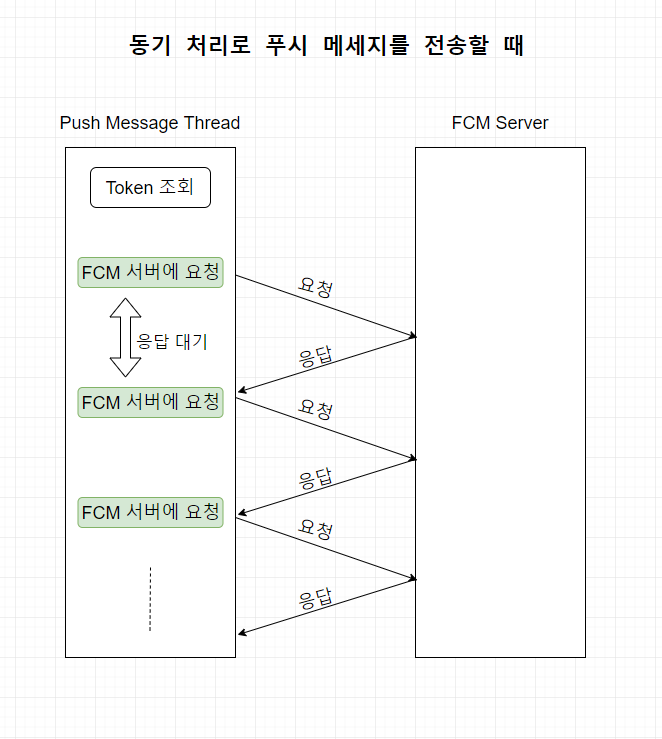 1. 사용자가 가지고 있는 토큰들을 조회한다. 2. 해당 토큰과 푸시 메세지 정보를 FCM 서버로 전송한다. 3. FCM 서버에서 응답이 정상적으로 올 때 까지 기다린다. 4. 다음 토큰을 조회하여 푸시 메세지 정보를 FCM 서버로 전송한다. ...(반복) |