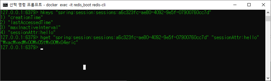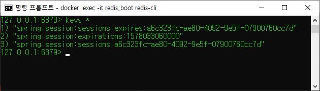 | spring:session:sessions:(session id) | hash | 세션의 생성 시간, 마지막 세션 조회 시간, 최대 타임아웃 허용 시간과 해당 세션에 저장한 데이터를 저장합니다. |